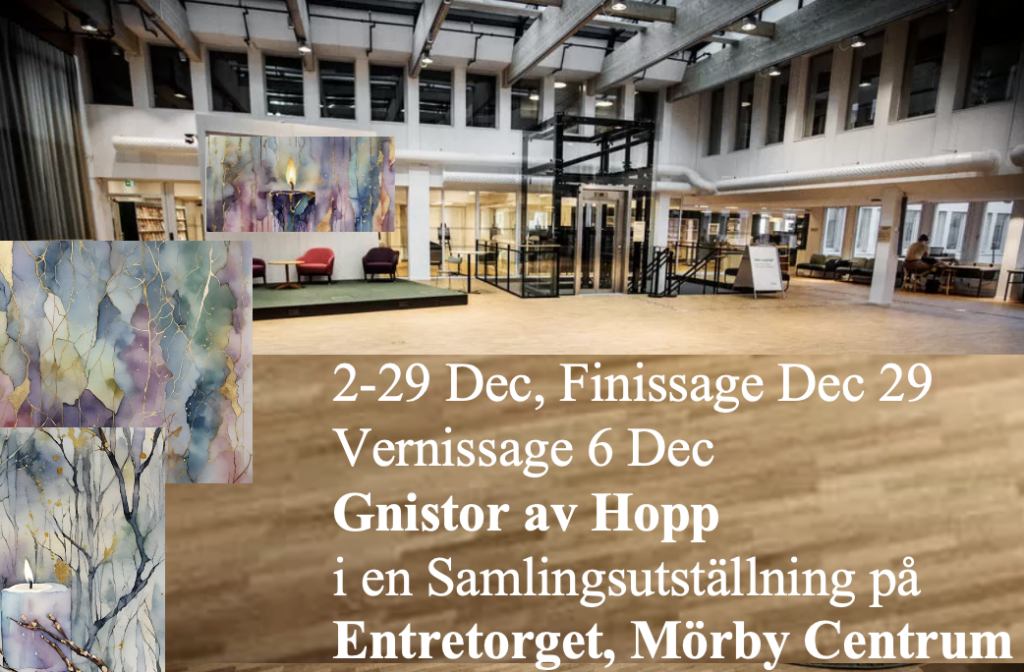 Novisali exhibits Sparks of Hope together with fellow artists from Danderyds Konstrum in an untitled group exhibition at Entretorget, Mörby Centrum, Danderyd, from December 2–29, 2025. Opening hours follow those of Mörby Centrum.