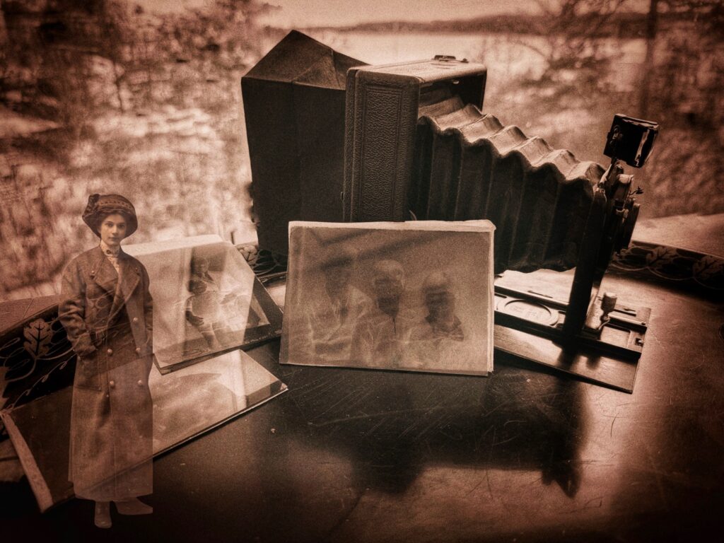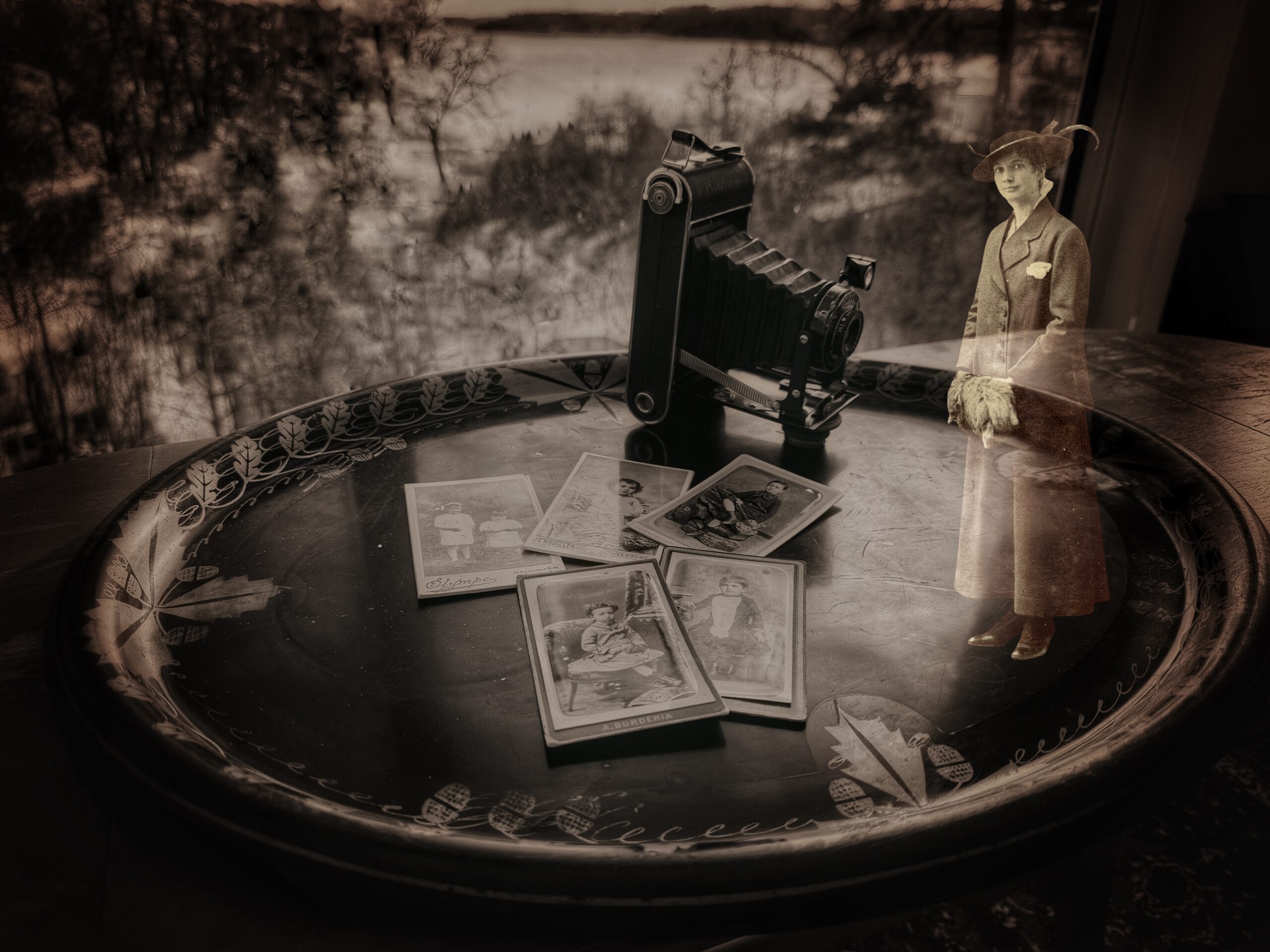 The first setup was built around an older large-format camera used for glass plate photography. The glass plates carry images of my grandfather, my father, and his siblings from the late 1920s. Through sepia tones, softened contrasts, and layered imagery, the photograph became less a document and more a carrier of memory. I placed my great-aunt Engla Hägertz — who herself took many of these photographs — into the composition in miniature form, allowing the photographer and the photographed to meet across time.