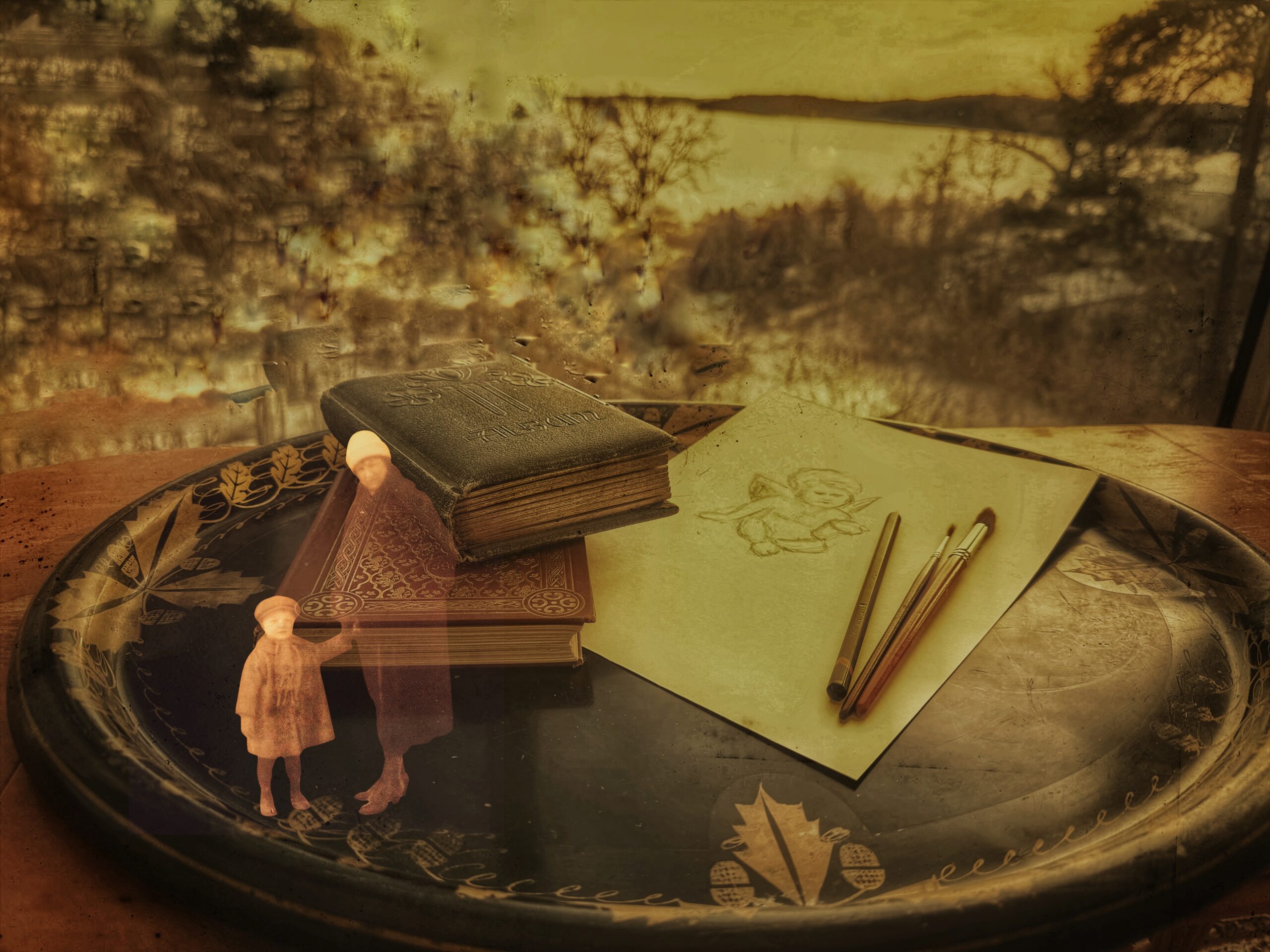 Den första uppsättningen utgick från en äldre storformatskamera för glasplåtsfotografi. Glasplåtarna bär bilder av min farfar, min pappa och hans syskon från slutet av 1920-talet. Genom sepiafärgade toner, mjuka kontraster och överlagrade bildlager blev fotografiet mindre ett dokument och mer en bärare av minne. Jag placerade in min gammelfaster Engla Hägertz — som själv tog många av bilderna — i miniatyrformat, så att fotografen och de fotograferade kunde mötas över tid.