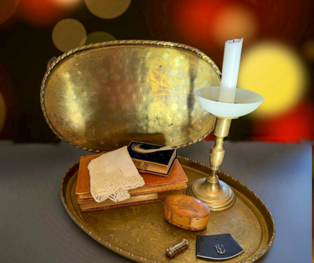 På en mässingsbricka vilar böcker, en psalmbok och små personliga fragment som bevarats över tid — en hårlock, en konfirmationsnäsduk, ett munspel som en gång spelats. Föremål som ofta hållits i händer, och sedan långsamt fått vila.