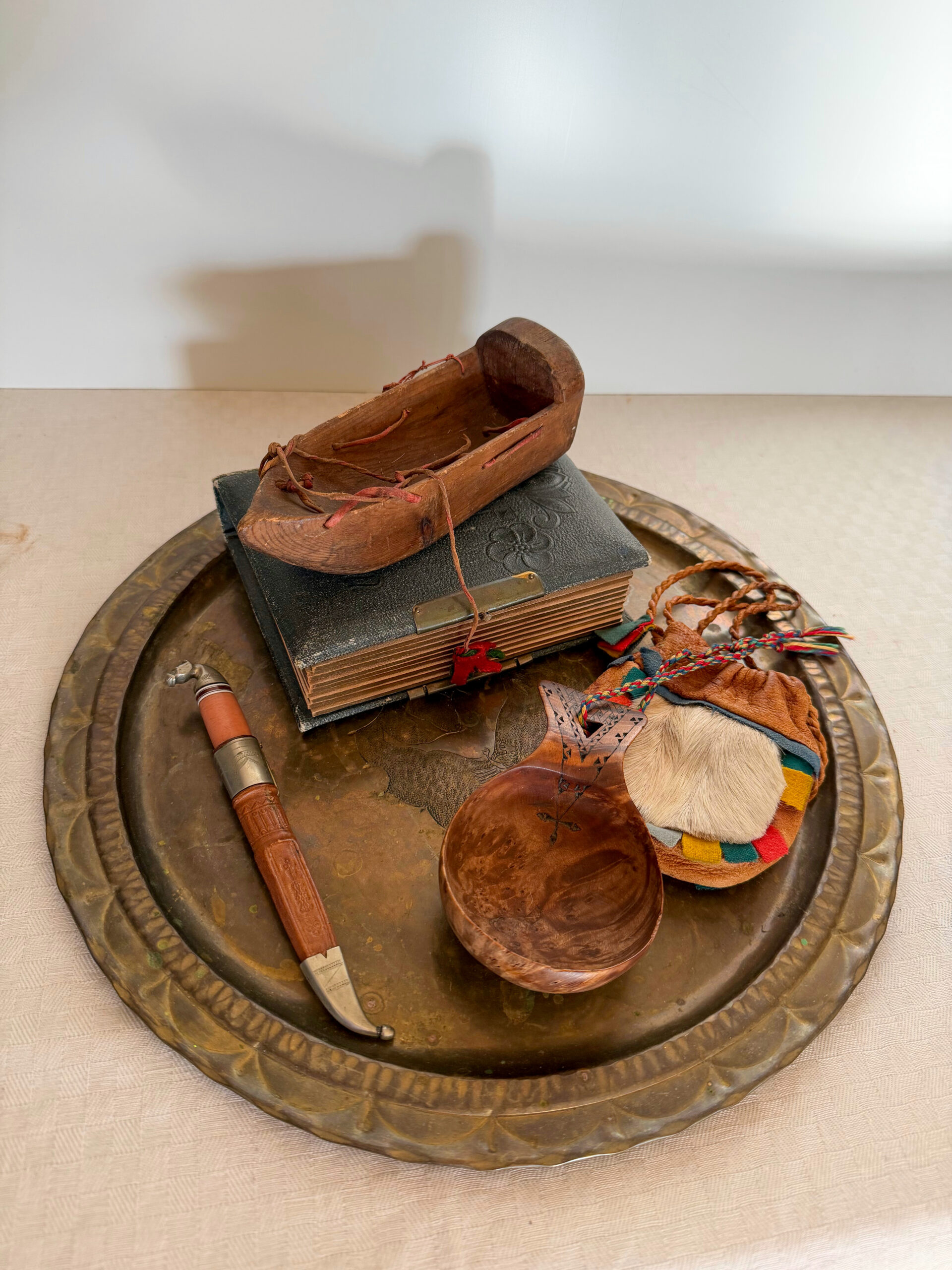 The third image carries traces of Sámi culture through objects given to my mother’s aunt Blanche during her years as a teacher. A small toy sled, a reindeer leather purse, a drinking cup (kåsa), a decorated Sámi knife.